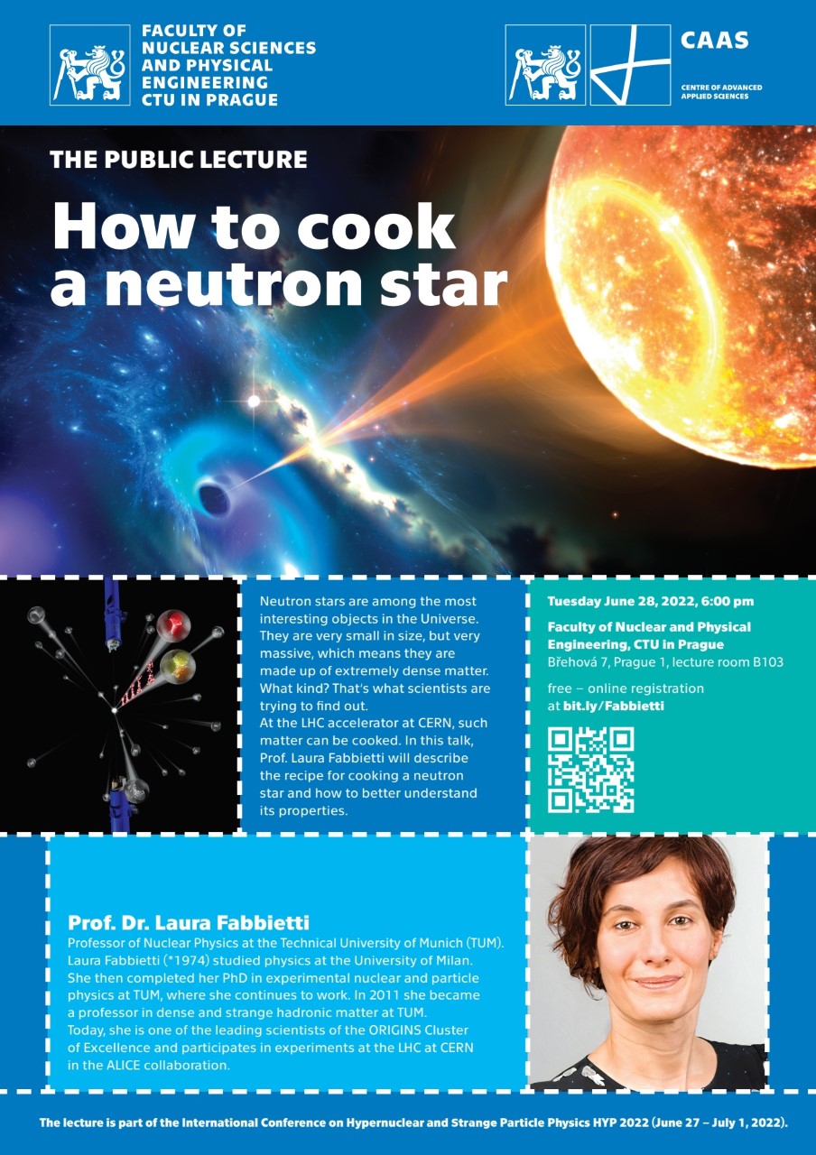 rádi bychom Vás pozvali na veřejnou přednášku prof. Laury Fabbietti : How to cook a neutron star , čili Jak se vaří neutronová hvězda. Prof. Fabietti je světově uznávanou kapacitou v odboru fyziky silných interakcí a je výborným řečníkem. Přednáška bude v anglickém jazyce. Pokud se ji rozhodnete navštívit, pořadatelé prosí, abyste se registrovali